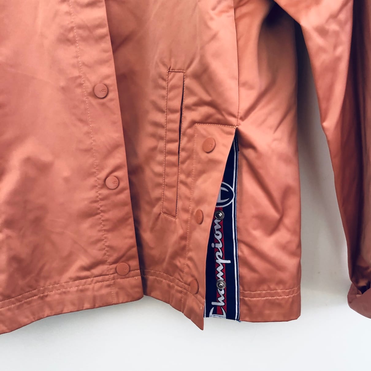 Crafted from a lightweight satin-like fabric, it features a smooth finish with a subtle sheen that elevates the traditional coach jacket silhouette. The piece is detailed with Champion’s signature embroidered logo on the chest, along with a branded tag at the collar.
